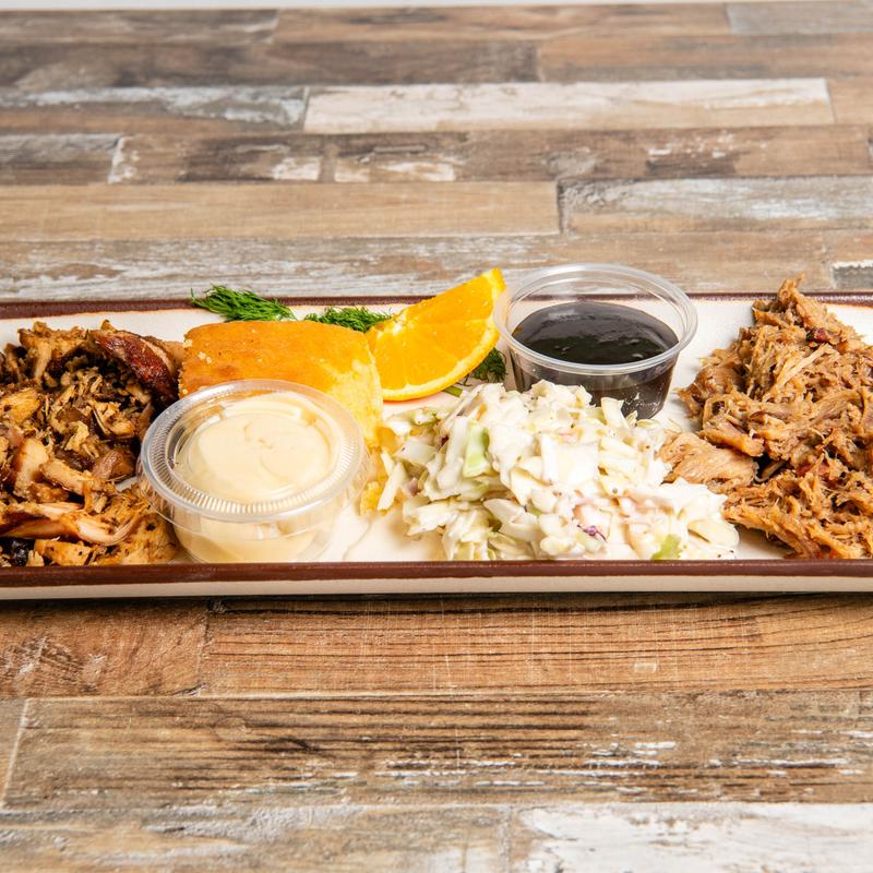 1 Meat $15.00 | 2 Meats $19.00 | 3 Meats $23.00 • Choose from smoked chicken and pulled pork. Served with cornbread and coleslaw • Sub Brisket +$5.00