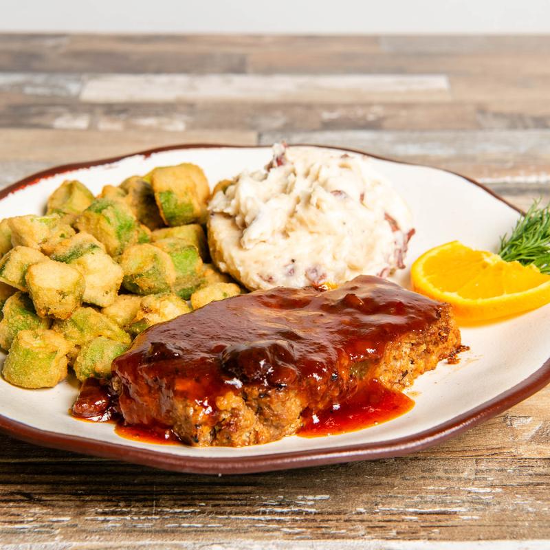Seasoned ground beef patties pan-fried and smothered in gravy. Served with mashed potatoes and fried green beans.