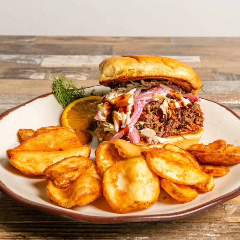 Chopped smoked brisket tossed in Martha’s Moonshine BBQ sauce with pickled red onions and coleslaw, served on a brioche bun.