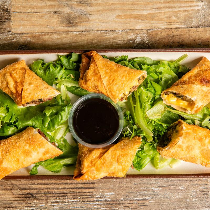 House-made egg rolls stuffed with collards and smoked brisket served with Martha’s Moonshine BBQ sauce.